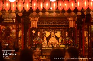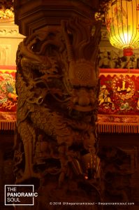 eyes on this traditional Chinese architecture. The temple is guarded by a huge stone lion on each side. As if the lions were not enough, each of its six pillars has a sculpture of a snake-like dragon coiled around it, guarding the three portals that serve as the entrance to the temple. Because of how meticulously carved the dragons were, it felt like they could come alive at any moment. Inside were several bright red wooden pillars with golden eaves. Rows of red lanterns hang freely across, bathing the temple with an otherworldly glow.